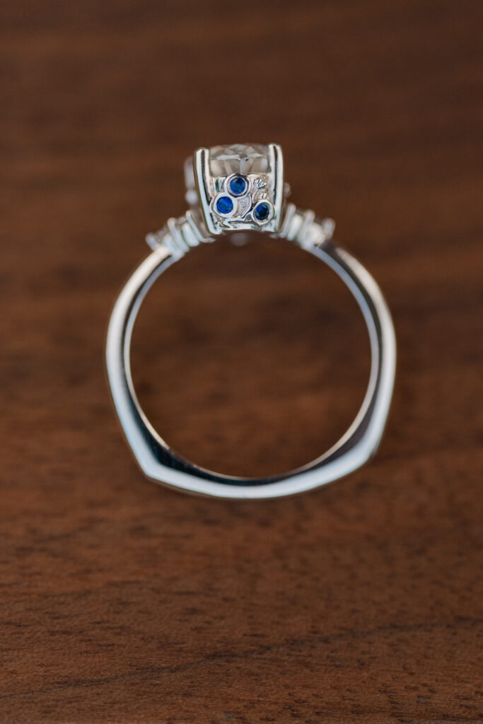 Set on either side of the diamond were three tiny sapphire blueberries, carefully crafted to honor her late grandmother—someone she used to spend summer days picking blueberries with as a child. It was a tribute wrapped in love and memory, and you could see how much it meant to her the second she realized what they were.